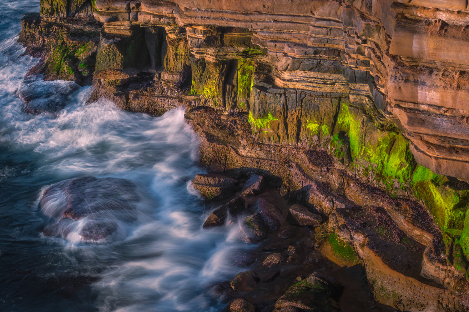 Colorful pattern of rocks under light shining in sunset in coastal beach of San Dieago, Southern California