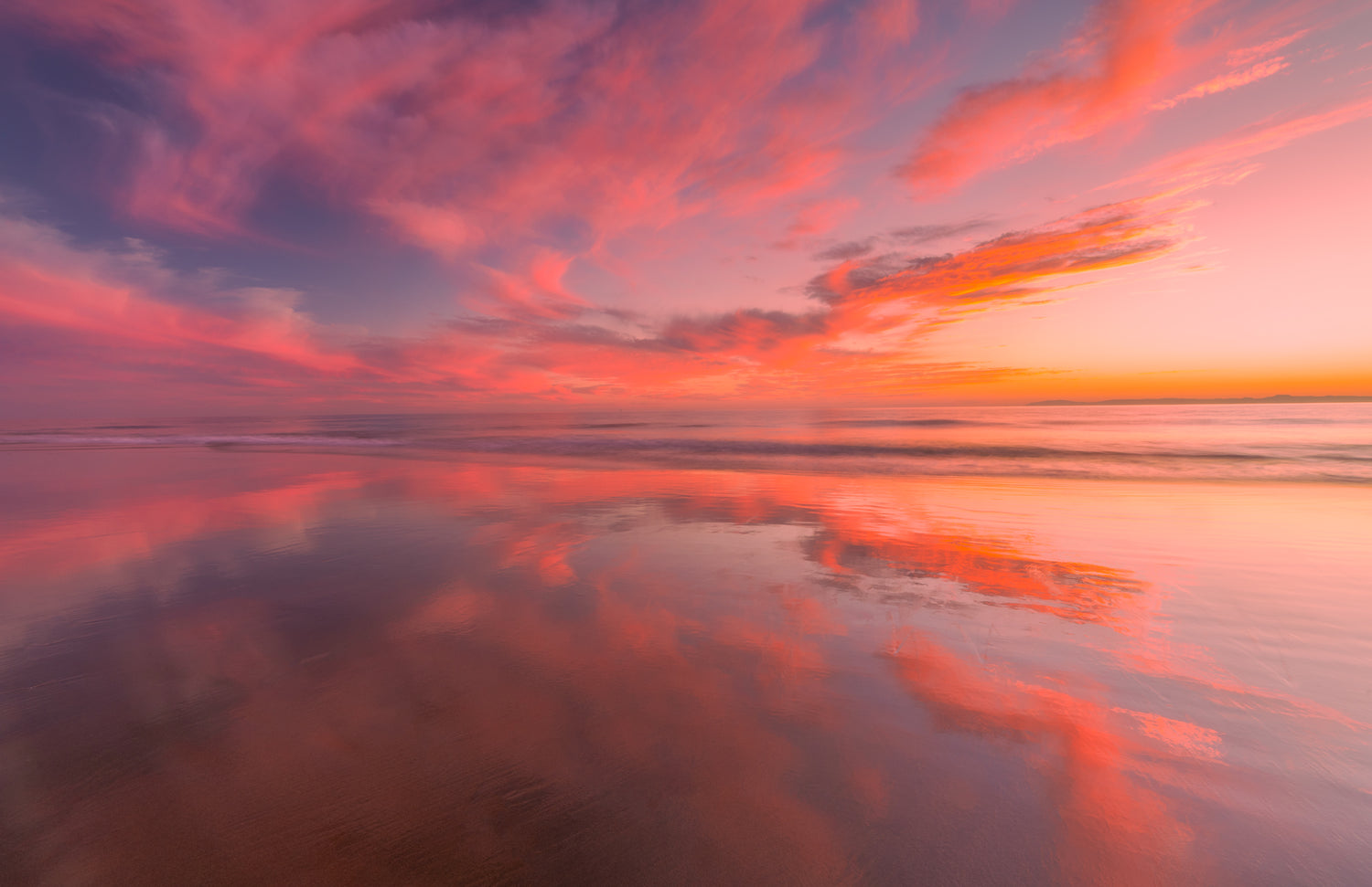 Textures and patterns of sand dunes in Oceano, Central California, after a rainy day under sunset lights creating the colorful paint of nature
