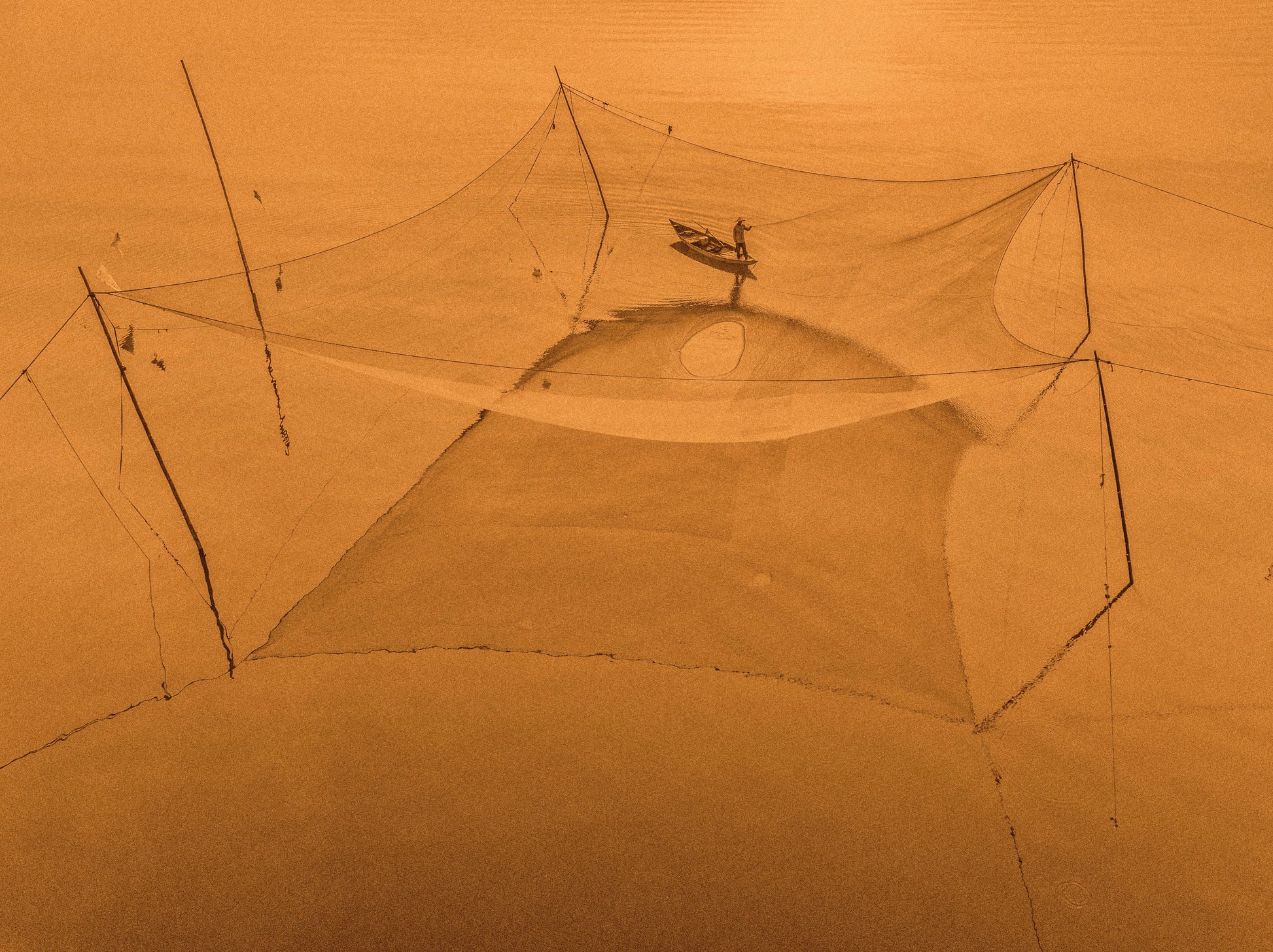 The fisherman is fulling the fishing net in bay of Cua Dai in central Vietnam