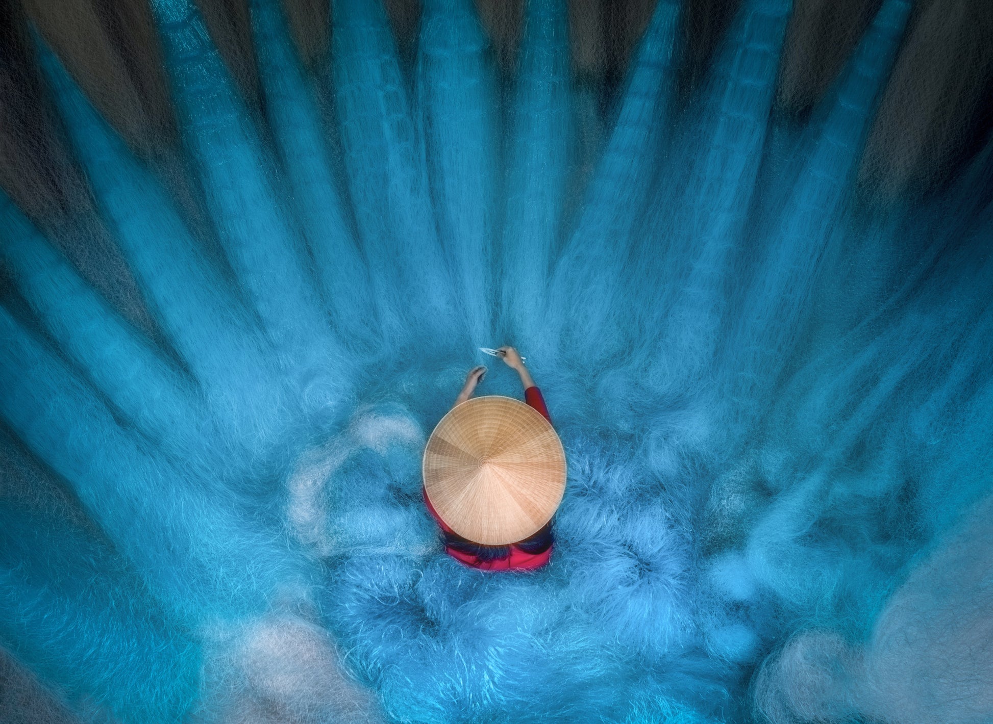 Aerial Capture of a woman is sewing the fishing net in the port of Hon Ro, southern province of Khanh Hoa, Vietnam. Fishing Net is always checked and sewed by local people before each trip of fishing