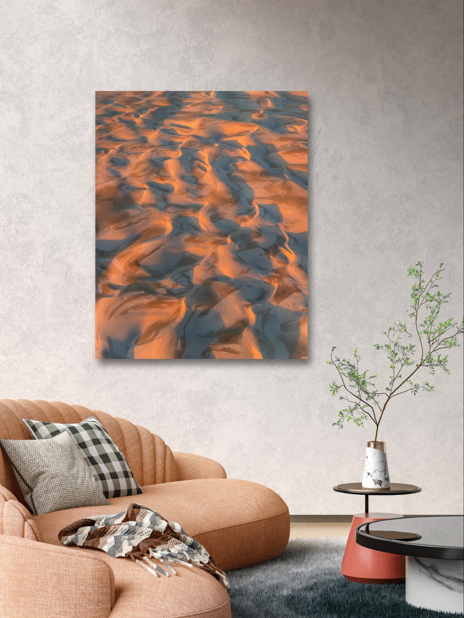 Textures and patterns of sand dunes in Oceano, Central California, after a rainy day under sunset lights creating the colorful paint of nature