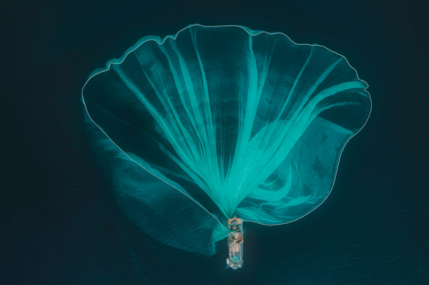 Anchovies fishing season is last from April to October yearly in south coastal provinces of Vietnam and fishermen often use large fishing net to catch fishes in the nearby shore. The photo captured from aerial when the boat is pulling nets, look like a giant leaf on the sea